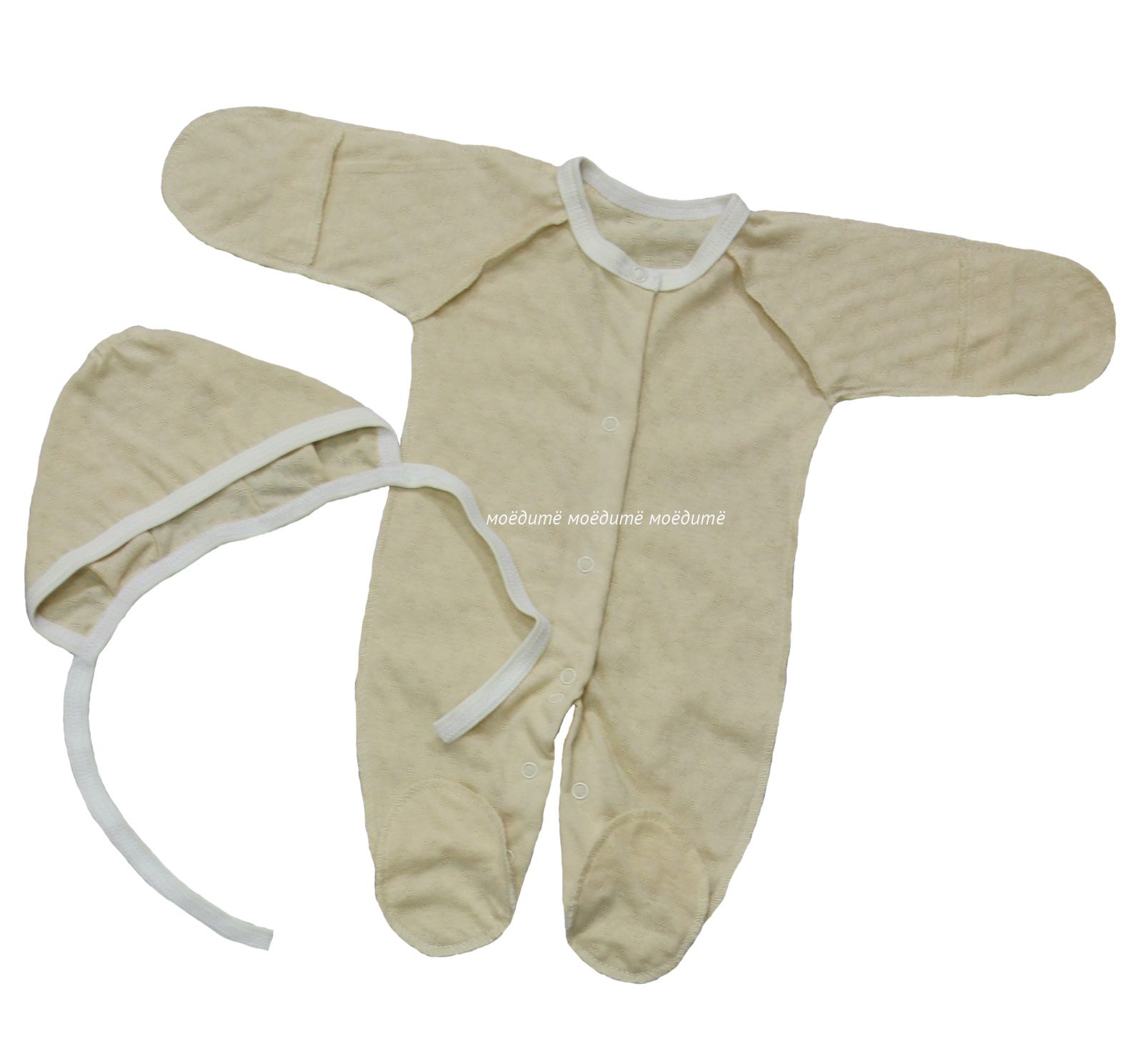 В комплект входит: удобный комбинезончик на кнопочках спереди и между ножек, чепчик на завязках.