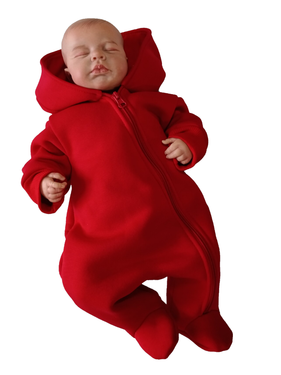 Комбинезон выполнен из футера двухнитки с начёсом. Спереди косая молния, капюшон на подкладке. У комбинезона закрытые ножки, на рукавах манжеты.